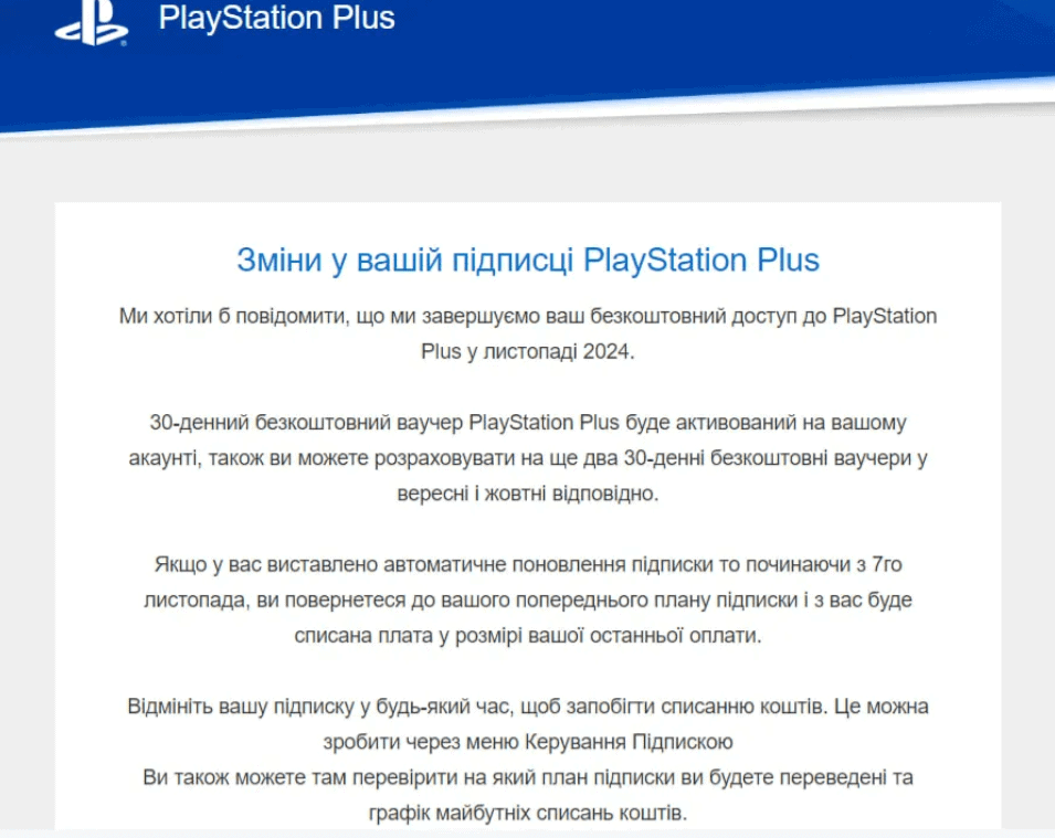 З листопада компанія Sony припиняє надання українцям безкоштовного доступу до підписки PlayStation Plus, який діяв з часу початку повномасштабного вторгнення Росії в Україну. Це означає, що користувачам, які користувалися цією послугою безкоштовно, знову почнуть автоматично списувати кошти з їхніх банківських карток за підписку на сервіс, повідомляє 24 канал.