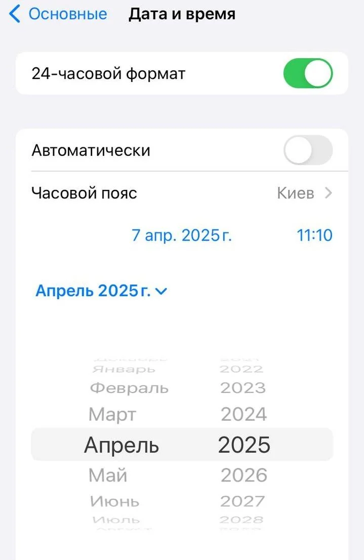 Потім переведіть iPhone в режим польоту та вимкніть Bluetooth і Wi-Fi, щоб уникнути проблем з iCloud, Apple Watch та іншими програмами. Після цього знову зайдіть у налаштування, “Загальні”, торкніться “Дата і час”, вимкніть “Автоматично” і змініть дату на рік вперед.