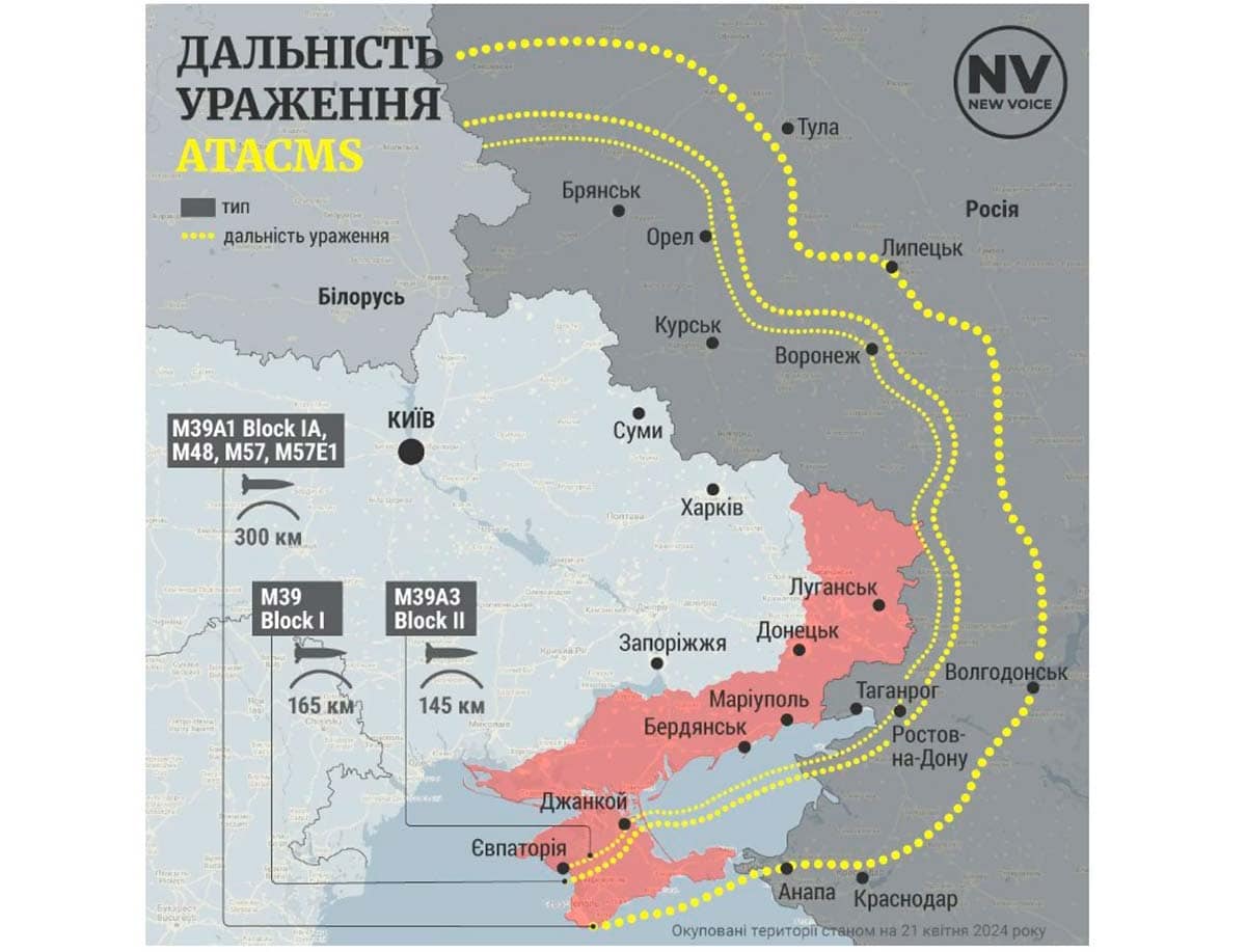 Україна давно і наполегливо доводила західним партнерам необхідність отримання далекобійної зброї на зразок ATACMS. Навіть за умови, що союзники України не дозволяють використовувати свою зброю для ударів по цілях у Росії, ракети з дальністю ураження до 300 км дозволяють ЗСУ охопити ворожі цілі на всій окупованій території України, нагадував портал Defence Express, що видно на мапі нижче.