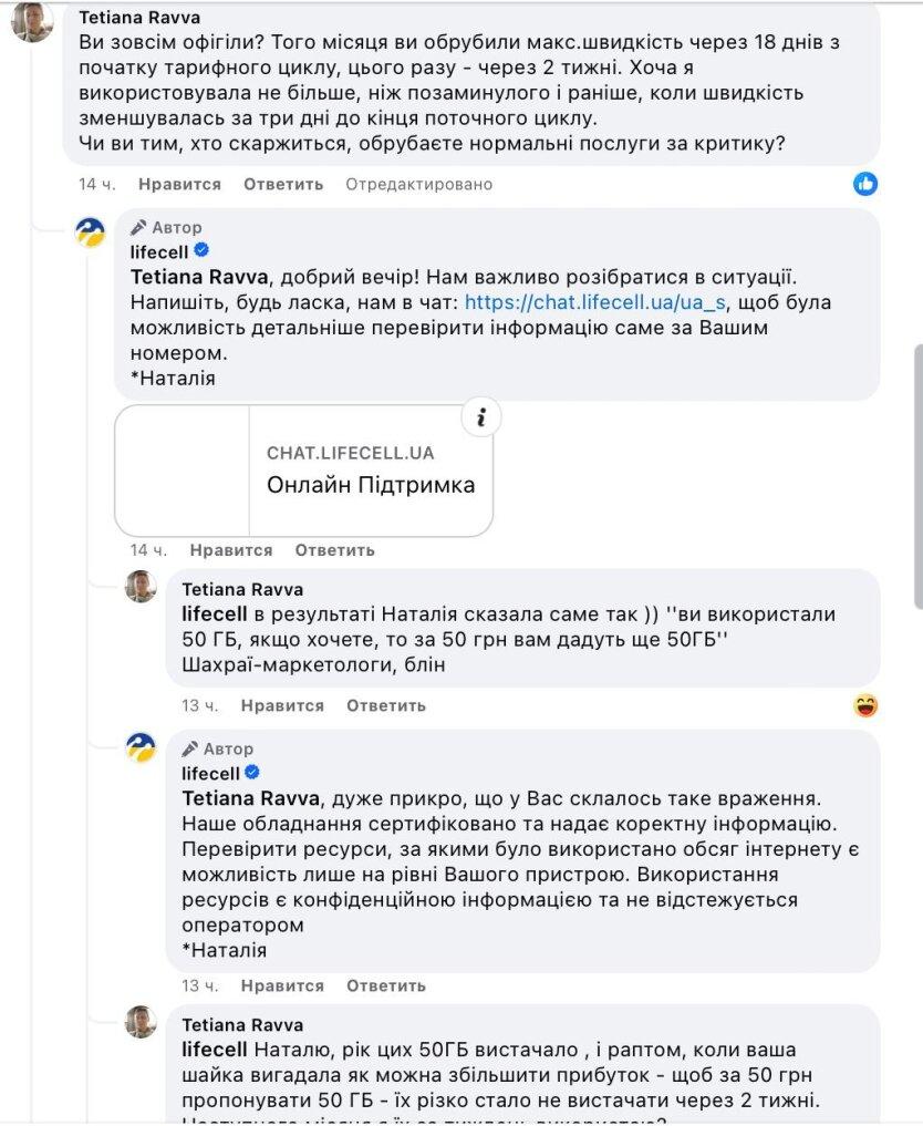 Клієнти компанії lifecell висловлюють незадоволення через обмеження максимальної швидкості інтернету за два тижні з початку їхнього тарифного циклу. За даними “Хвилі”, користувачка написала на сторінці компанії у Facebook про це.