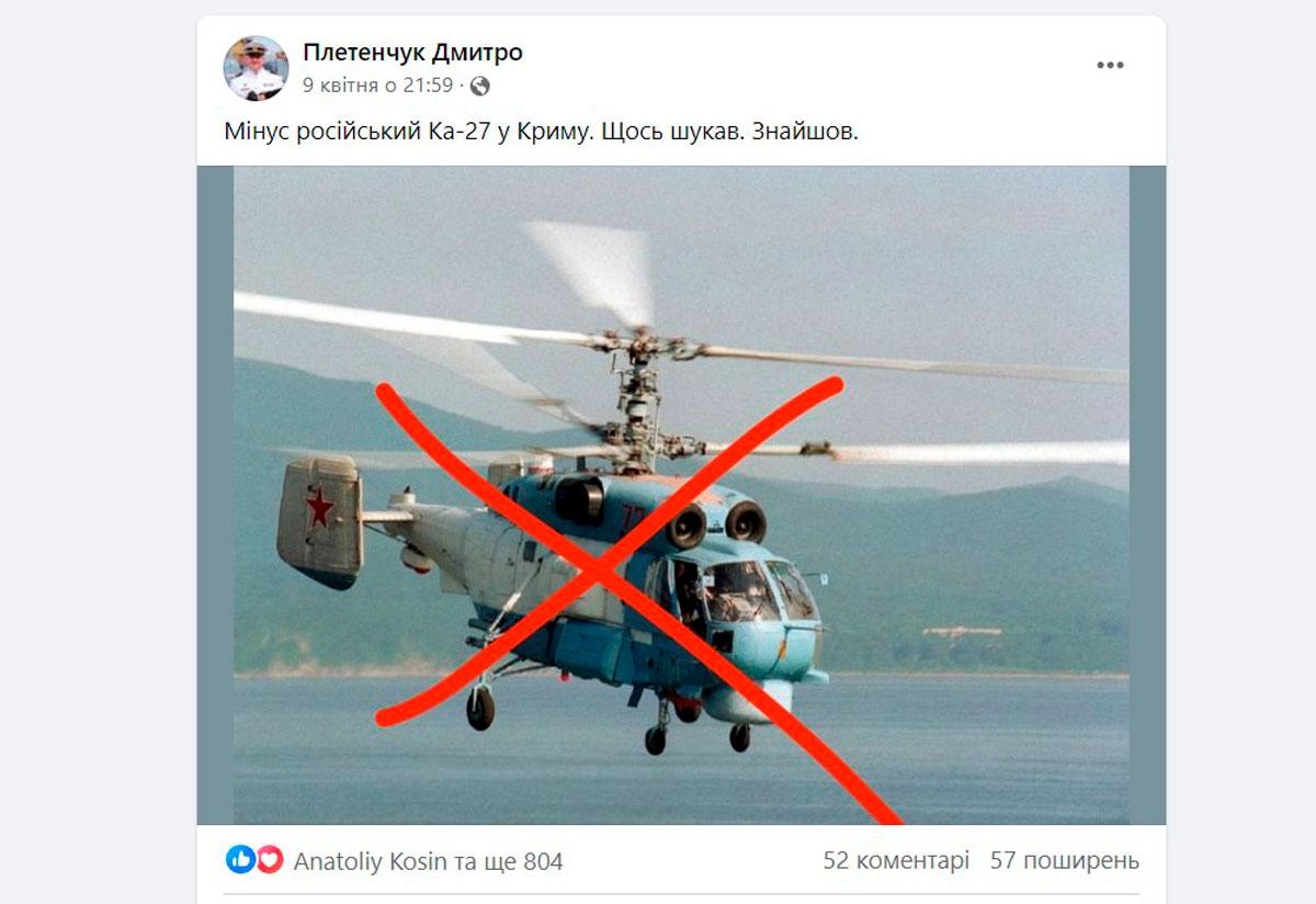 Офіційних підтверджень катастрофи гвинтокрилів немає. Але представник ВМС України Дмитро Плетенчук зробив неоднозначну заяву: “Мінус російський Ка-27 у Криму. Щось шукав. Знайшов”.