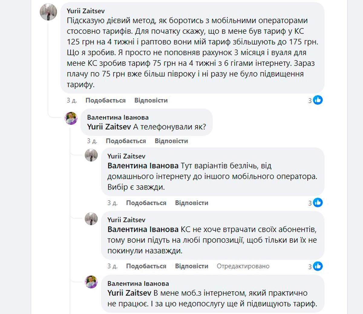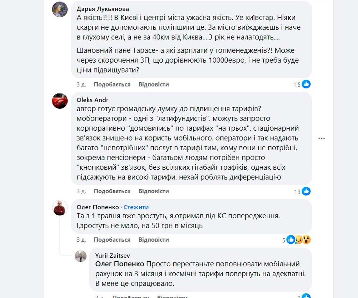 У відповідь на цю публікацію читачі залишили чимало невдоволених коментарів з думкою про те, що Завгородній таким чином “готує грунт” і налаштовує громадськість на підвищення цін. Дехто почав ділитися своїми рекомендаціями, як змусити операторів не підвищувати тарифи.