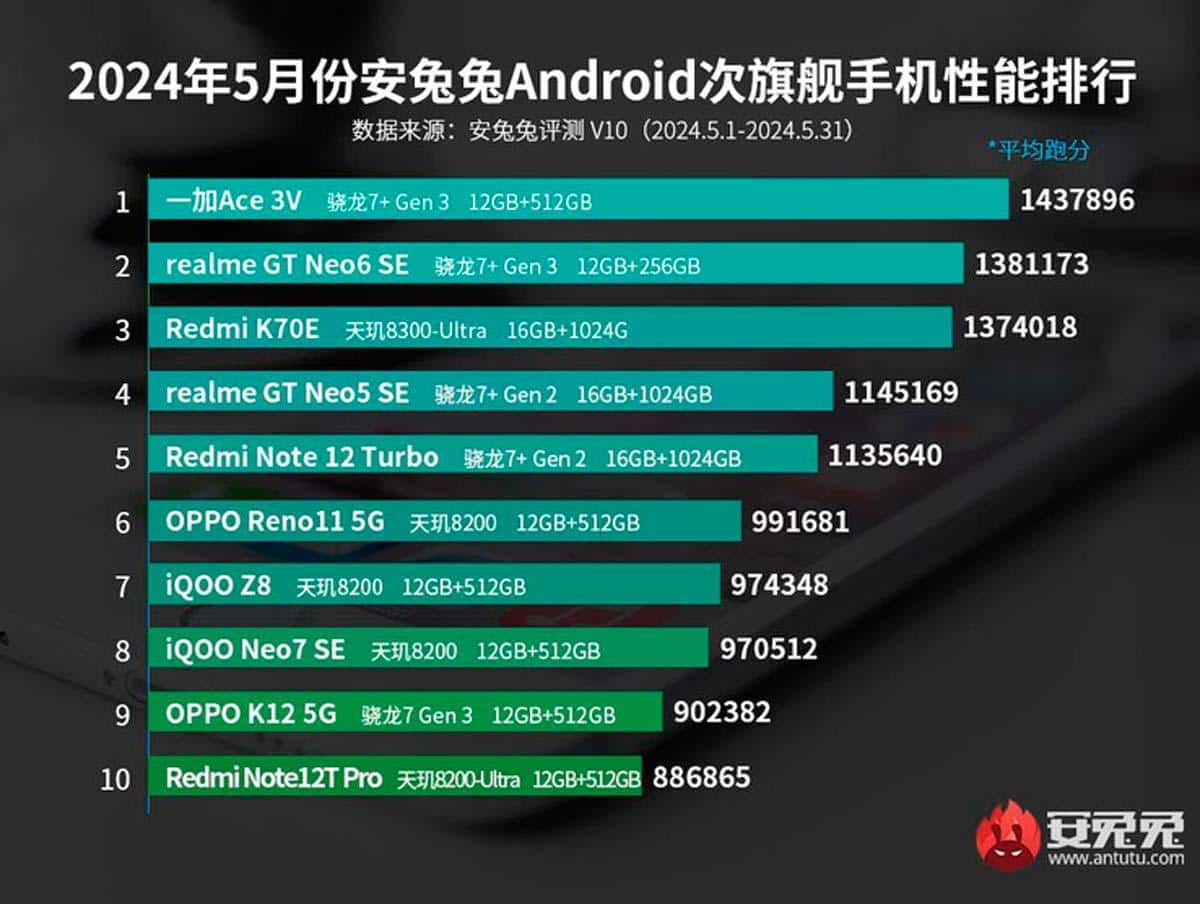 Другим телефоном у списку є Realme GT Neo6 SE, який також має процесор Snapdragon 7+ Gen 3. Він отримав у середньому 1 381 173 бали. Redmi K70E (пізніше його було перейменовано в Poco X6 Pro) впорався з ним, і це перший телефон із процесором MediaTek SoC, який увійшов до списку. Цей телефон оснащений Dimensity 8300 Ultra, і він посів третє місце із середнім балом 1 374 018.
