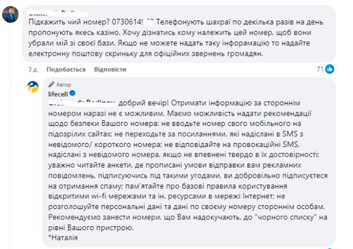 На офіційній сторінці компанії у Facebook абонент попросив інформацію про один з телефонних номерів, з якого йому, нібито, постійно дзвонять і пропонують зіграти в казино. У відповідь пресслужба Lifecell пояснила, що компанія не має права розголошувати інформацію про телефонні номери. Водночас у компанії порекомендували, як мають діяти абоненти в таких ситуаціях: